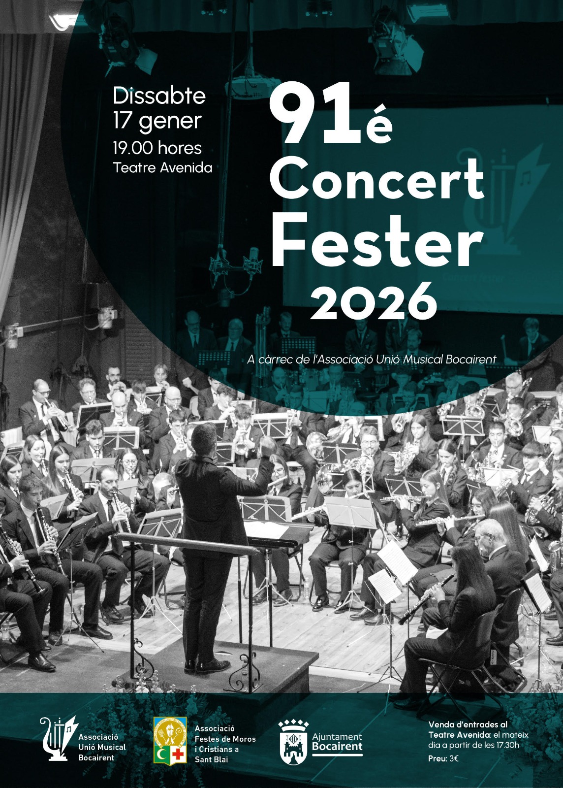 Dissabte 17 de gener, a les 19 hores i en el Teatre Avenida, es realitzarà el 91 Concert Fester a càrrec de l’Associació Unió Musical de Bocairent, amb el repertori que s’adjunta en el pdf.