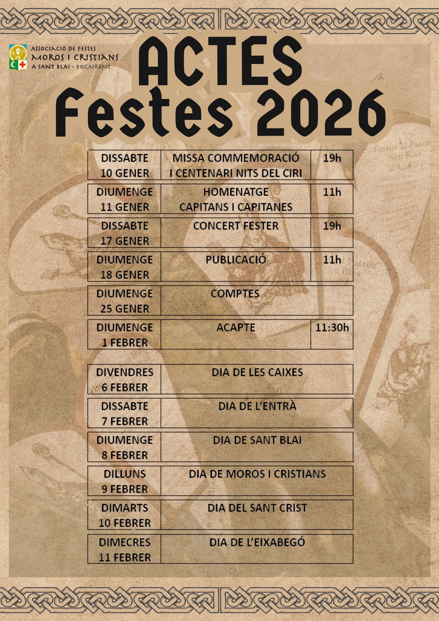 Ací tenen les dates dels diferents actes que es realitzaran a partir del mes de gener i que desembocaran en els dies grans de festes. Enguany amb una efemèride destacada, la del primer centenari de les nits del ciri. La missa i commemoració del centenari es farà el dissabte 10 de gener a les 19 hores. Més endavant donarem més detalls sobre aquest acte.